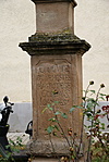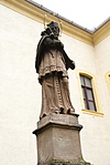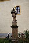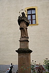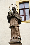 Alul kissé kihasasodó párkányos posztamens, rajta kisebb talapzaton áll Nepomuki Szt. János szobra. /Karingben, palásttal, birétummal, kezében kereszt és pálmaág./