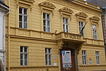 Zártsorú beépítésben álló, egyemeletes, nyeregtetős, szabálytalan alaprajzú épület. Középtengelyben nyíló kapuja fölött erkéllyel.