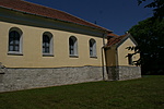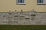 A hajó déli homlokzatán befalazott sírkövek. A templom kertjében másodlagosan felállított Mária megkoronázázsát ábrázoló dombormű, népies barokk. Kő emlék.