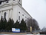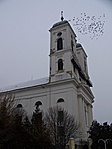 Háromhajós, Ny-i oldalán félköríves záródású templom, K-i homlokzata felett toronypárral. A homlokzatot ion oszloppárral alátámasztott timpanon fogja át. A templom cseboltozatos belső térében körbefutó, kétszintes karzat. Berendezés: 19. század közepe; karzaton festett padok, 18. század közepe. Orgona: 1906, átépítve (Kerékgyártó István, Angster-orgonagyár). A középkori templomot 1653-ban állították helyre, a 18. században kétszer bővítették, az új templom építése 1826-ban indult (építész: Homályossy Ferenc), de elakadt, s csak 1844-ben folytatódott (építész: Hild József).