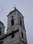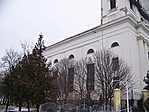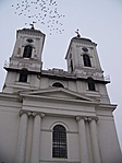 Háromhajós, félköríves záródású, két homlokzati tornyos templom. Főhomlokzatán kettőzött jón oszlopokkal alátámasztott timpanon.