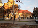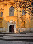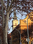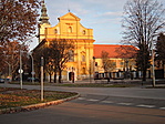 Egyhajós, egyenes szentélyzáródású, nyeregtetővel fedett, keletelt templom, a szentély K-i homlokzata előtt álló toronnyal. A toronysisak és tűzkiáltó erkély, 1835 (építész: Homályossy Ferenc). A templom D-i homlokzatához sekrestye és rendház (trsz.: 3920) csatlakozik. A Ny-i homlokzat főpárkánya felett díszes oromzat, a Ny-i kapu fölött Szentháromság-szoborcsoport puttókkal, 1784. Keresztboltozattal fedett tér, Ny-i oldalon karzattal. Falképek: 1930-as évek (Steffek Albin); színes üvegablakok, 20. század első fele. Berendezés: 18. század közepe (Hebenstreit József), át- vagy újrafestett oltárképekkel. Korábbi templom helyén 1723-tól épült (építész: Giovanni Battista Carlone). Kriptáját 1874-ben eltömték.