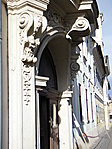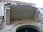 Az egyenes záródású erkélyajtót keskeny, tükrös pilaszterek szegélyezik, voluta formájú fejezettel, melyből füzérdísz lóg le. Kétoldalt egy-egy voluta kapcsolódik a pilaszterekhez. A golyvázott szemöldökpárkány konvex-konkáv vonalú, megtört. Kétoldalt egy-egy kis váza, középen kagylódísz emelkedik rajta. Az erkélyajtó frízének felirata: CURIA COTTIUS STRIGONIENSIS.