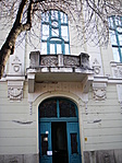 A földszinti ablakok könyöklői apró gyámsoron nyugszanak, alattuk szalagdísz van. Felettük függőlegesen osztott, négyszögletű falmezők sorakoznak, melyekben négyzetsor húzódik. Oldalt füzérdíszek csüngenek le, az ablakok mellé. A szemöldökgerenda alján fogrovatsor látható, felette virágdísz kapott helyet. A rizalit ablakai szélesebbek. A kapu felett ugyanilyen falmező található.