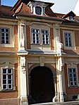 Tükrös törzsű, tagolt fejezetű szárkövei vannak. Ezeken nyugszik a szalagkeretes kosárív, melyet az övpárkány frízének tetejéig érő zárókő tagol. A zárókőben a Bourbon-liliomhoz hasonló faragás látható, melynek középső szirma kagylóvá alakul, melyből alul virág- és füzérdísz csüng le. A kapu két oldalán egy-egy átlós irányban kifelé forduló, lépcsőzetesen előreugró falpillér emelkedik, voluta formájú fejezettel. A két falpillér törzsén levélből kiemelkedő kagylómotívum látható.