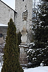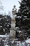 Esztergom Kertváros főútján, a templomkertben áll. Fejezetes-lábazatos kő talapzaton, íves-hasas oszlopon, magasan elhelyezve látjuk a kőszobrot, az Atya, a Fiú, a Szentlélek és Mária alakját. Az Atya a baljában gömb, a Fiú karján kereszt, a galamb Szentlélek tízágú vas sugárnyalábban. Erősen restaurált, ha ugyan nem új.