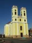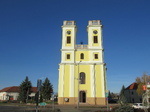 A település központjában, szabadon álló, kereszt alaprajzú, egyenes szentélyzáródású, két, D-i homlokzati tornyos templom, a szentély felett kontyolt nyeregtetővel, a szentélyzáródás É-i oldalához kapcsolódó kétszintes, téglalap alaprajzú sekrestyével. A tornyok sisaknélküliek, balluszteres attikával lezártak, a két tornyot balluszteres korlát köti össze. Csehsüveg boltozatú és félkupolás belső terek, a hajó bejárati oldalán karzat. Falképek: 1938 (Döbrentei Gábor). Festett üvegablakok: 1982 (Mohay András). Berendezés: jellemzően 18. század vége és 19. század második fele; főoltárkép: 1889 (Koroknyai Ottó). Épült 1780-1791 között, tornyait 1828-ban emelték. 1977-ben felújították. A templom Ny-i hajófala előtt: kőfeszület fémkorpusszal, 19. század vége.