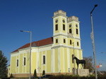 A település fő utcáinak kereszteződésében szabadon álló, nagyméretű, kereszt alaprajzú épület két, homlokzata síkjában emelkedő toronnyal, egyenes szentélyzáródásához kapcsolódó, téglalap alaprajzú, emeletes sekrestyével. Az épületrészek kontytetőit cserép fedi, a tornyok sisak nélküliek. Ny-i hajófala előtt kőfeszület fémkorpusszal.
