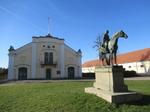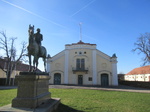A kastély (kórház) és a lovarda közötti téren, kőtalapzaton álló, életnagyságúnál kisebb bronzszobor.
