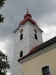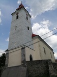 A nyugati homlokzatot szinte teljesen elfoglalja a 3 emeletes, négyzetes alapú torony, mely felfelé keskenyedik. Az alapja meredeken, hirtelen esik az utca felé. A harmadik emeletig 15. századi, míg a 3. emelet faragott terméskőből épült 1792-ben. A földszinten, a torony nyugati oldalán 1-1 támpillér. A torony 1. emeletén az északi és déli oldalon 1-1 téglalap alakú, kicsi ablak, a nyugati oldalon kör ablak. A torony déli oldalán nyílik a főbejárat, mely félköríves záródású, kétszárnyú és szalagkeretes. A 2. emeleten az északi és nyugati oldalon 1-1 kicsi, félköríves, középkori ablak, a déli oldalon nagyobb méretű szintén félköríves záródású ablak. Az alsó két emeletet párkány zárja le. A harmadik emeleten a sarkokon egyszerű falpillérek között félköríves záródású harangablakok. Órapárkány, törtvonalú, bádoggal (?) fedett sisak. A téglalap alakú hajó falai dísztelenek, mindkét oldalon 2-2 szegmensíves záródású szalagkeretes ablak.