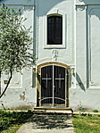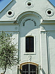 Homlokzat feletti torony, sarkain ismét bojtdíszes pilaszterek. Szegmensíves harangablakok, órapárkány, törtvonalú sisakdísz. Kapu felett stukkódísz: almafa a kígyóval.