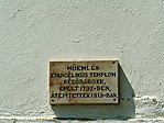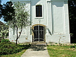 Délkeleti, vagyis főhomlokzatán magas lábazat, a homlokzatot kis kiülésű, bojtos díszű pilaszterek 3 részre osztják. A két szélső mezőben kis mélyedésű faltükör. Középső mezőben szalagkeretes, szegmensíves kétszárnyú kapu, eredeti ajtószárnyakkal. Felette szalagkeretes, záróköves, szegmensíves ablak. A homlokzat alsó részét főpárkány zárja, mely a homlokzat középső szakasza felett félkörívet ír le. A félkörívben felirat: "Erős vár a mi Istenünk". Egyenes oromzat, illetve háromszögű oromzatban 3 darab kör alakú ablak.