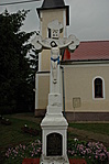 A templomkertben Lourdes-i barlang és feszület, felirattal.