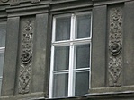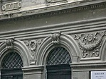 Az oromzatos ablakok mellvédjeiben kőbábos kor-lát, a többi ablakban fűzérdíszes-rozettás mellvéd kapott helyet. Az oromzat nélküli ablakok felett, nagyméretű tányérokban nöi fej-domborműveket helyeztek el. A harmadik emeleti, félköríves záró-dású, tagozatos keretezésű ablakok félköríveit ma-gában foglaló, rozettás falmezők felett egyenes szemöldökpárkányok készültek, amelyek középső szakasza, - az ívzáró díszre támaszkodva - kiug-rik. Az épület második és harmadik emeleti hom-lokzata falsávozott. A homlokzat szobrászati díszítését a Szandház testvérek készítették.