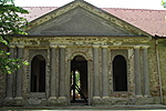A középső 3 tengely rizalitban, előtte terasz , melyre 4 lépcsőfok vezet. A nyílászárók: két félköríves záródású ablak között félköríves záródású kétszárnyúbejárat. A tengelyeket páros dór féloszlopok választják el egymástól . A homlokzaton végigfutó főpárkány , rizalitban farovattal díszítve. Rizalit felett tympanon hasonló tagolással.