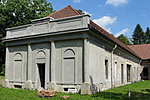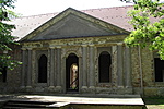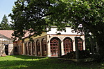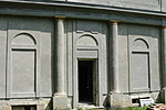 széleken 1-1 téglalap alakú vakablak , felettük mélyített félköríves szemöldök . Középső kialakítása hasonló , de ebben a tengelyben téglalap alakú egyszárnyú bejárat. Szélső tengelyekben 1-1 fektetett téglalap alakú pinceablak. Pince csak ezen a részen. A tengelyeket dór féloszlopok választják el egymástól. Tagolt főpárkány atikafallal a főhomlokzattal szembeni nyugati homlokzat : 5 tengelyes