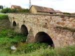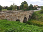 Kőhíd, 3 félköríves nyílással, melyeket téglalap alakú bemélyedő tükör foglal egy keretbe.