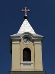 A torony alsó részét osztópárkány zárja, az emeleten sarokpillérek között félköríves záródású harangablakok egyszerű geometrikus köténnyel. Órapárkány, óra nélkül, gúlasisak.