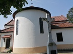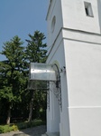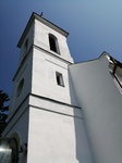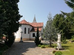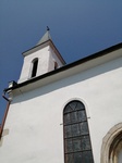 Tornya 3 szintes, a szinteket egymástól osztópárkányok választják el. A középtengelyben nyíló kapu félköríves záródású, neoromán jellegű, fölötte kovácsoltvas, indadíszes előtető. A következő szint bemélyedő tükrös kialakítású, elől kör, oldalt téglalap alakú, kereteletlen ablakokra. A 3. Szint lábazatos, sarkai élszedettek, ablakai mint a hajóéi, záródásuk szalagkeretes. A szentély mögött kő feszület. A templomot az út felől terméskő fal keríti.
