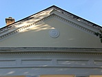 Utcai homlokzata közepén portikusz, melynek gerendázatát négy toszkán oszlop, illetve ezeknek vonalában, a fal mentén négy toszkán pilaszter tartja. A háromrészes gerendázat achitrávja tagolatlan, fríze tükrökkel díszített, geiszonja fogrovatos. A gerendázaton tagozott keretezésű, fogrovatos timpanon emelkedik, közepén kördísszel. A portikuszra pofafalakkal övezett lépcső vezet. A portikusz alatt pilaszterekkel osztott belső falon két félkörzáródású, szalagkeretes, nyújtott ablak között nyílik a kétszárnyú bejárati ajtó, felette tagozott szalagkeretes táblázat. Az utcai homlokzat falsávval keretezett szélső részeit egy-egy, egyenes záródású, tagozott szalagkeretes, tükrös, fogrovatos szemöldökkel alakított ablak osztja. Ezen, s az oldalhomlokzatokon a portikusz párkányának felső két része végig fut.