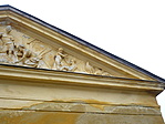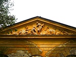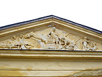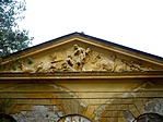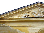 Középrizalitját domborműves timpanon zárja, falait vakolatkváder díszíti, a középrész sátorteteje fölött lanternaszerű torony.