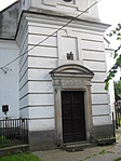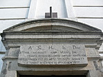 Az É felé néző főhomlokzat sávozott falában egyenes záródású kőkeretes kapu nyílik, szemöldök részében chronostichonos felirattal.