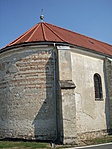 A templom félköríves záródásánál öt vaskos támpillér áll.