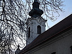 Tagolt homlokzati főpárkánya felett ión fejezetű sarokpilaszterekkel közrefogott toronytest enyhe ívű oromfalháromszögek között. A sarkokat faragott rokokó kővázák díszítik. A toronytesten körben négy félköríves záródású harangablak, órakörös főpárkány órákkal, felette nyolcélű párnás bádogsisak. A templom D-i oldalán kórusfeljáró ajtó, három barokk kori támpillér és három szegmensíves ablak. É-i oldala hasonló, oldalkapu nélkül.