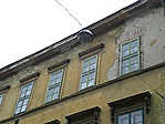 Erőteljes ázásnyomok találhatók a lábazatnál, valamint a felső szinteken, és megjelentek a falfirkák is.