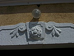 Szalagkeretes, félköríves, zárókővel díszített bejárata fölött félköríves, szalagkeretes, félig elfalazott ablak, fölötte legyeződísz, ezeket pilaszterek keretezik.