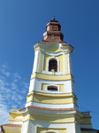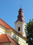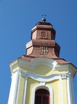 A torony íves attikafallal kapcsolódik a hajóhoz. A torony első szintjén szegmensíves záródású kisablakok, felettük, a harangok szintjén nagyobb záróköves, szalagkeretes félköríves ablakok. Az órapárkány fölött lanternás, barokkos toronysisak.