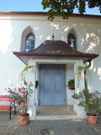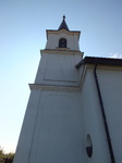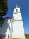 A torony földszintjén egyenes záródású ajtó, fölötte körablak, a golyvázott párkány fölött az első szinten és a másodikon is félköríves ablakok. A tornyot bádogsisak zárja.