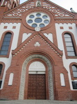 Bejárata a hosszház ÉK-i homlokzatából nyílik. Félköríves, bélletes, téglával, növényi ornamentikával díszített, enyhe rizalittal kiugró, háromszögű oromzattal ellátott bejárat két oldalán félköríves falfülke. Fölötte két félköríves záródású ablak, melyet két támpillér fog közre. A homlokzat is háromszög záródású. Az oromzatot tégladíszes rozetta díszíti.