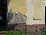 A málló vakolatú, vizesedő foltok továbbra is megvannak a lábazaton és a párkányok felett, így az épület állapota változatlan.