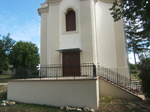 Temető felett szabadon álló, lépcsősoron megközelíthető, egyhajós templom, Ny-i