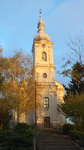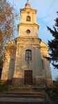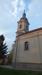 A település központjában, utcákkal határolt kis dombon szabadon álló, egyhajós templom, Ny-i homlokzata elé kilépő toronnyal, a hajónál keskenyebb, poligonális záródású szentéllyel, a szentély felől kontyolt nyeregtetővel, a szentély D-i oldalán sekrestyével. A hajóban fiókos donga-, a szentélyben fiókos dongaboltozat és félkupola. A hajó Nyi végében fiókos dongaboltozatos orgonakarzat. Kifestés: korábbi festés fölött 1938 (Vass Bertalan), restaurálva: 2004. Berendezés: 18. század második fele. Építéséhez hozzájárult herceg Esterházy Antal. Felújítva: 1978-1979. A templomkertben: romantikus talapzaton Szentháromság-oszlop (1801), Nepomuki Szent János-szobor (1835), Kálvária-szoborcsoport (1830-1832).