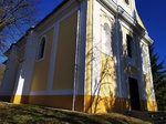 A település központjában, kisebb dombon szabadon álló, lépcsősoron keresztül megközelíthető, egyhajós templom, D-i homlokzati toronnyal, a hajónál keskenyebb, egyenes záródású szentéllyel, annak K-i oldalán félnyeregtetős sekrestyével, a szentély felől kontyolt nyeregtetővel. A D-i homlokzat enyhe kiülésű középrizalitjában nyíló bejárat, a két oldalsó falszakaszon félköríves, üres fülkék, felettük szemöldökpárkány. A hajó oldalhomlokzatain két-két lépcsős támpillér. A hajóban, a szentélyben és a sekrestyében csehsüveg boltozat, a hajó déli végében csehsüveg boltozatos orgonakarzat. Berendezés: jellemzően 18. század vége. Feltehetően korábbi, középkori templom falait felhasználva építtette Batthyány József bíboros-hercegprímás. Felújítva: 1864, 1922, 1933, 1997. 1922-ben készült a toronysisak, 1933-ban, majd 1961-ben a belső festés. Az út túloldalán, az utcavonaltól beljebb, részben kőfallal kerített saroktelken áll a plébániaház (hrsz.: 238/1): földszintes, téglalap alaprajzú, kontyolt nyeregtetős, alápincézett épület, kerti homlokzata előtt oszlopos, mellvédes tornác. Kéttraktusos, síkmenynyezetes belső, részben 19. századi nyílászárók. Épült 1843-ban, megújítva 1878-ban.