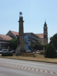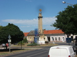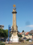 Kovácsoltvas kerítéssel övezett, hasáb alakú, erőteljes lábazattal és párkánnyal ellátott, sarkain volutás támokkal tagolt talapzaton álló, felfelé keskenyedő, fejezetes pillér, homlokoldalának felső részén fém koronát tartó angyalokkal, tetején Szentháromság szoborcsoporttal. A talapzat oldalain domborművek Szent Kristóf, Szent György, Xavéri Szent Ferenc és Gáspár János helyi plébános (1808-1848) ábrázolásaival, a saroktámok fölött Passaui Szent Valentin, Szent Sebestyén, Szent Donát és Szent Vendel szobrai, valamint a homlokoldalon konzolon Immaculata-szobor; a homlokoldal előtt oltárasztal. A talapzat latin nyelvű felirata szerint 1823-ban állították. Magyar nyelvű felirata szerint 1882-ben újíttatta Bartil Antal, ugyanekkor készült a kovácsoltvas kerítés is. Restaurálva: 1980-as évek.
